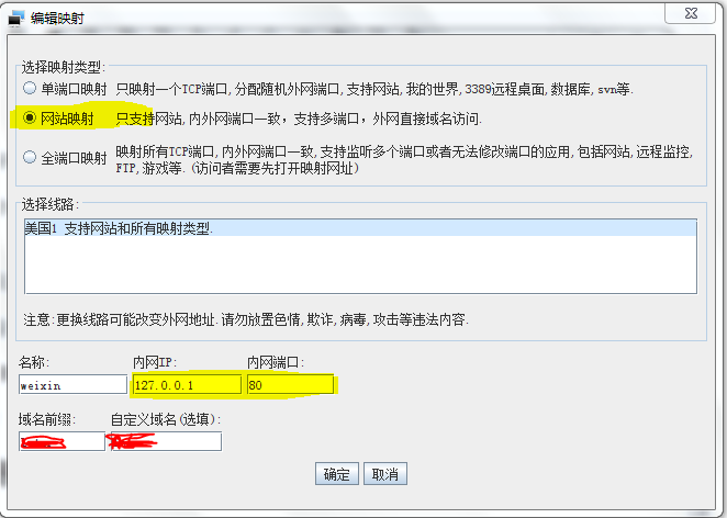 注意这里的映射类型选择网站映射, 内网端口设为80端口
