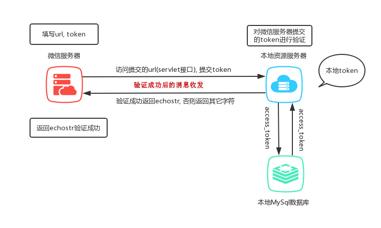先说一下token验证流程原理, 自己的资源服务器和微信服务器进行绑定, 提交的url为token验证的接口(servlet), 微信服务器会把echostr发到自己资源的服务器, 然后我们的服务器进行token验证, 看看是否匹配. 匹配之后再将echostr返回给微信服务器, 这样服务器就绑定成功. 同时, 我们自己的资源服务器和微信服务器的消息收发都是通过验证token的那个接口(servlet)来实现的.