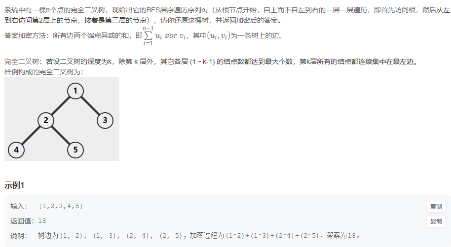long res=0;public long tree1 (int[] a) {if(a==null||a.length==0)return 0;TreeNode root = build(a, 1);getSum(root);return res;}private TreeNode build(int[]a,int index){if(index>a.length)return null;TreeNode treeNode = new TreeNode(a[index-1]);//二叉树性质,左节点等于父节点位置*2 注意不能使用(索引+1)*2,如果从0开始//(0+1)*2导致下一个访问的索引为2treeNode.left=build(a,index*2);treeNode.right=build(a,index*2+1);return treeNode;}private void getSum(TreeNode root){if(root==null)return;if(root.left!=null)res+=root.val^root.left.val;if(root.right!=null)res+=root.val^root.right.val;getSum(root.left);getSum(root.right);}