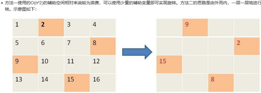 public int[][] rotateMatrix(int[][] mat, int n) {//一层一层的进行交换,从最外层开始进行交换int rotateTimes=n/2;int i=0,low=0,high=n-1;while (i++<rotateTimes){for (int j = 0; j < high - low; j++) {//用1 4 13 15交换来举例int temp=mat[low][low+j];//记录1的值mat[low][low+j]=mat[high-j][low];//13换到1的位置mat[high-j][low]=mat[high][high-j];//16换到13的位置mat[high][high-j]=mat[low+j][high];//4换到16的位置mat[low+j][high]=temp;//1换到4的位置}low+=1;//往内层循环走,最低层+1high-=1;//最高层-1}return mat;}