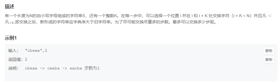 public int turn (String s, int k) {int n=s.length();int res=0;//分为k组for(int i=0;i<k;i++){//临时计数数组int[] cnt=new int[26];for(int j=i;j<n;j+=k){//当前字符对应下标int index=s.charAt(j)-'a';for(int id=0;id<index;id++){//如果有小于当前字符的情况,则加上对应次数res+=cnt[id];}//当前字符计数加一cnt[index]++;}}return res;}