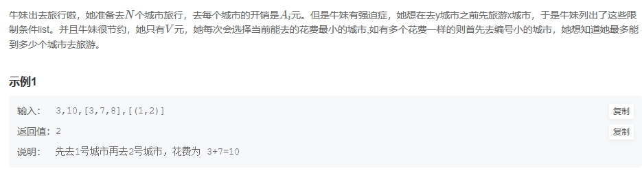 public int Travel (int N, int V, int[] A, Point[] list) {//初始化优先队列 {费用,城市索引}PriorityQueue<int[]> queue=new PriorityQueue<>(//按照城市费用升序,如果相等就按照索引升序 (如有多个花费一样的则首先去编号小的城市)(o1,o2)->o1[0]==o2[0]?o1[1]-o2[1]:o1[0]-o2[0]);//初始化入度数组、后置城市数组int[] Indeg=new int[N];int[][] limit=new int[N][N];//给后置城市数组和入度数组赋值for(Point p:list){limit[p.x-1][p.y-1]=1;Indeg[p.y-1]++;}//如果入度为0,则表示可以访问,加入到队列for(int i=0;i<N;i++){if(Indeg[i]==0){queue.offer(new int[]{A[i],i});}}//记录最多可去城市数目int cnt=0;while(!queue.isEmpty()){int[] city=queue.poll();//取出最小的数int cost=city[0];//费用int id=city[1];//索引//如果剩余花费不够,则直接跳出循环if(V<cost) break;//费用够,减去当前费用V-=cost;cnt++;//可以去的城市数量增加for(int j=0;j<N;j++){//存在后置城市if(limit[id][j]==1){//后置城市的入度减一Indeg[j]--;//如果入度为0,则加入到队列if(Indeg[j]==0){queue.offer(new int[]{A[j],j});}}}}return cnt;}