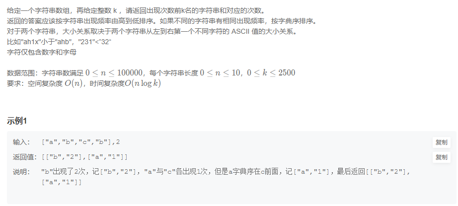 public String[][] topKstrings (String[] strings, int k) {HashMap<String, Integer> map = new HashMap<>();for (int i = 0; i < strings.length; i++) {map.put(strings[i],map.getOrDefault(strings[i],0)+1);}//使用list对HashMap进行排序ArrayList<Map.Entry<String, Integer>> list = new ArrayList<>();list.addAll(map.entrySet());//指定排序规则Collections.sort(list,(m1,m2)->{//出现的次数相等按照字符集升序(要选择小的那个),否则按照出现次数降序return m1.getValue()==m2.getValue()?m1.getKey().compareTo(m2.getKey()):m2.getValue()-m1.getValue();});if(k>strings.length)k=strings.length;String[][] ans=new String[k][2];for (int i = 0; i <k ; i++) {ans[i][0]=list.get(i).getKey();ans[i][1]=list.get(i).getValue().toString();}return ans;}