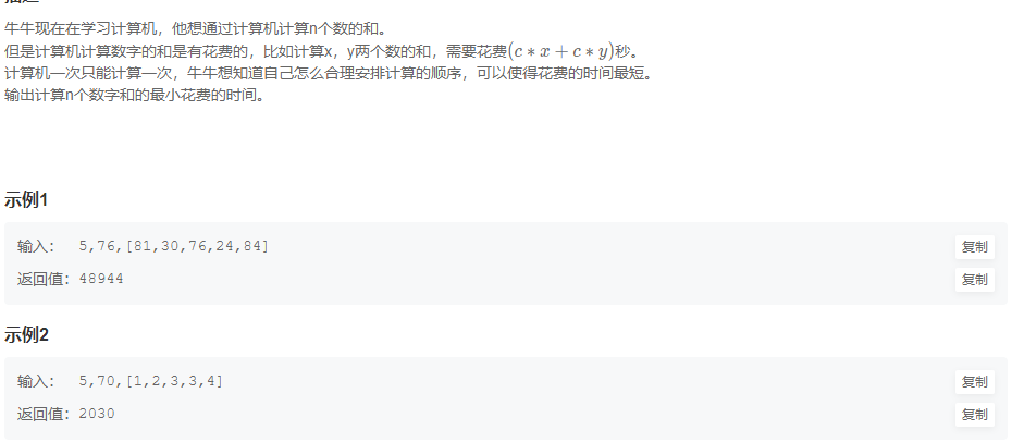 //由于计算机只能计算一次,所以每次取两个最小的值进行计算public long solve (int n, int c, int[] a) {long res=0;PriorityQueue<Integer> pq=new PriorityQueue<>();for (int i : a) {pq.offer(i);}while (pq.size()!=1){int x=pq.poll();int y=pq.poll();int xy=x+y;res+=xy;pq.offer(xy);}return c*res;}