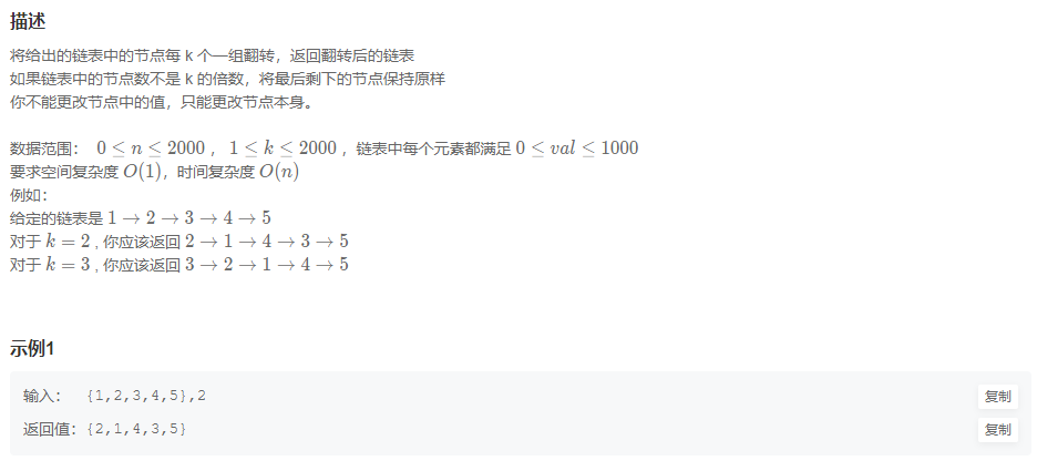 public ListNode reverseKGroup (ListNode head, int k) {ListNode prev = null,curr = head;ListNode next;int times = k;while (times-- > 0){//经过k次以内的循环,已经超过了链表的长度if(curr == null){//将当前翻转过的链表进行还原 //对于1->2->3->4->5 k=3来说//当遍历到curr==null的时候 prev=5 此时的链表情况为 3->2->1--->(5->4->null)//restore后3->2->1->4->5return restore(prev);}//在k次之内进行链表的翻转next= curr.next;curr.next = prev;prev = curr;curr = next;}//头结点(现在是尾节点)的下一个节点为翻转链表后的头节点 1->2->3->4 2->1->4->3head.next = reverseKGroup(curr, k);return prev;}private ListNode restore(ListNode head){ //不足k个时再反转还原ListNode prev = null,curr = head;ListNode next;while (curr != null){next=curr.next;curr.next = prev;prev = curr;curr = next;}return prev;}