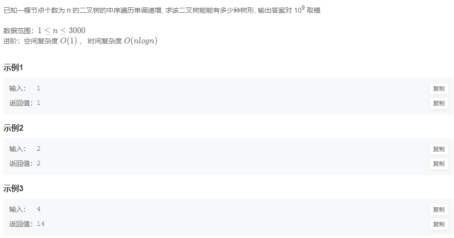 public int numberOfTree(int n) {//初始化dp数组long[] dp = new long[n + 1];//没有节点和只有一个节点的情况dp[0] = 1;dp[1] = 1;for (int i = 2; i <= n; i++) {//找到每一个节点(从1到i的每一个数对应一个节点)为根的情况,并进行累加//左子树的数量为j-1,右子树的数量为i-jfor (int j = 1; j <= i; j++) {dp[i] = (dp[i] + dp[j - 1] * dp[i - j]) % mod;}}return (int) dp[n];}