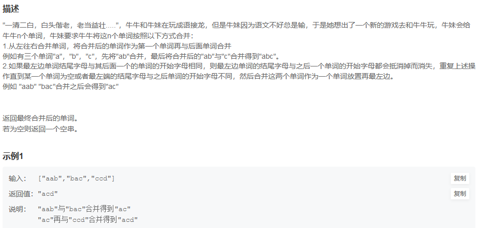 public String WordsMerge (String[] Words) {StringBuilder sb= new StringBuilder("");for (String word : Words) {sb.append(word);}int n=sb.length();char last=sb.charAt(0);for (int i = 1; i <n ; i++) {if(sb.charAt(i)==last){//左闭右开区间sb.replace(i-1,i+1," ");last=' ';}last=sb.charAt(i);}//清除所有的" "return sb.toString().trim();}
