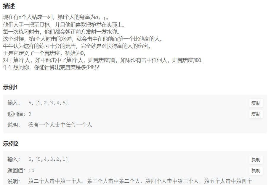 //,这也是可以利用栈来解决的原因public long solve(int n, int[] a) {long ans = 0;Stack<Integer> stack = new Stack<>();for (int i = 0; i < n; i++) {//如果栈不为空并且栈中的数据小于当前数据(说明打不到),栈中的元素一直弹出while (!stack.empty() && a[i] >= a[stack.peek()]) stack.pop();//如果到这里栈不为空的话说明有能被枪打到的元素 其值为索引+1if (!stack.empty()) ans += stack.peek() + 1;//无论如何都把当前元素索引放进栈中stack.push(i);}return ans;}