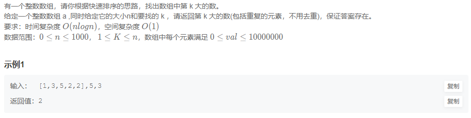 public int findKth(int[] a, int n, int K) {PriorityQueue<Integer> priorityQueue = new PriorityQueue<>(new Comparator<Integer>() {@Overridepublic int compare(Integer integer, Integer t1) {return t1.compareTo(integer);}});for (int i = 0; i < n; i++) {priorityQueue.offer(a[i]);}//k先--再比对是否为0while (--K!=0){priorityQueue.poll();}return priorityQueue.peek();}