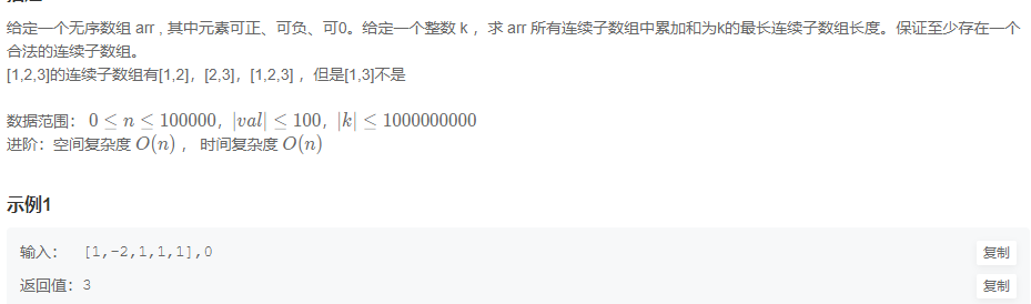public int maxlenEqualK(int[] arr, int k) {if (arr == null || arr.length == 0) return 0;int n = arr.length;HashMap<Integer, Integer> map = new HashMap<>();//记录每一个和以及出现的位置map.put(0, -1);//初始化int res = 0;int sum = 0;for (int i = 0; i < n; i++) {sum += arr[i];//如果满足条件就比较当前最大值if (map.containsKey(sum - k)) res = Math.max(res, i - map.get(sum - k));//没有当前和就将其放入哈希表,因为是按照顺序遍历的,后面如果出现同样的和可以直接舍弃if (!map.containsKey(sum)) map.put(sum, i);}return res;}