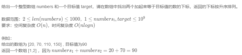 public int[] twoSum(int[] numbers, int target) {int n = numbers.length;HashMap<Integer, Integer> map = new HashMap<>();for (int i = 0; i < n; i++) {int realTarget = target - numbers[i];if (map.containsKey(realTarget)&&map.get(realTarget)!=i) {return new int[]{map.get(realTarget)+1,i+1};}else map.put(numbers[i], i);}throw new IllegalArgumentException("No solution");}