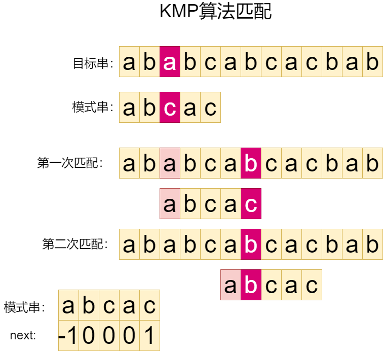 例:使用KMP算法把下图中的模式串在目标串进行进行查找,返回第一次出现时的下标:
