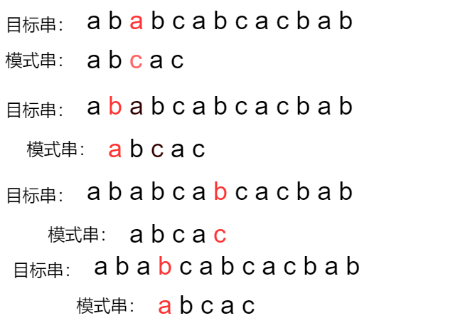 - 从目标串的第0个字符,挨个进行比较,遇到不相等的字符就停止。