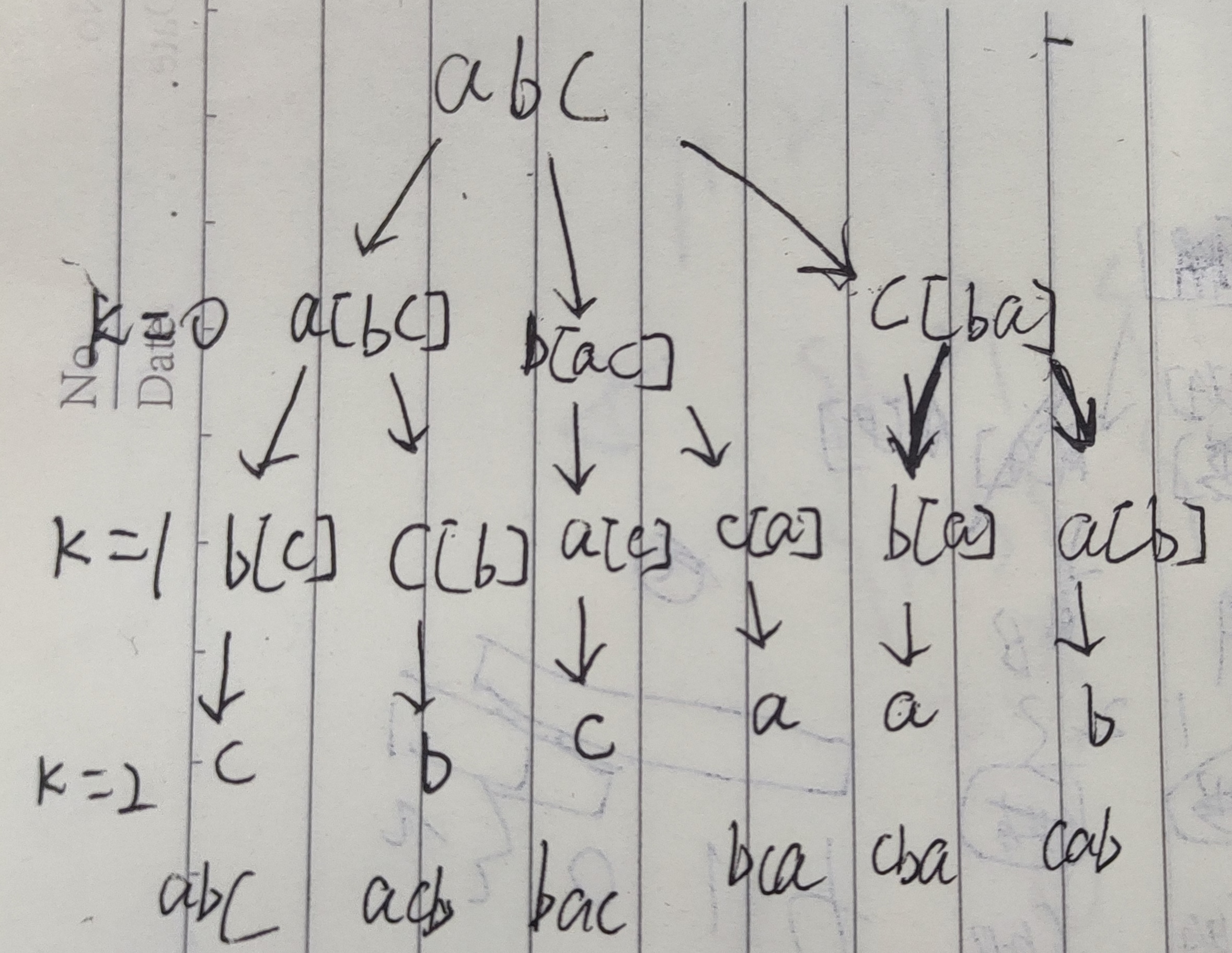 程序大致流程:比如第一支分路,先确定 a 从 a 开始,往下递归,再依次确定 b 和 c ,到达边界条件,把当前数组情况 abc,存入集合。再回溯,恢复交换前的状态(abc),因为 k=1 时,for循环还未执行完,进行第二轮,交换 b、c位置,确定了 c ,往下递归,k=2 时,确定了 b ,到达边界条件,把当前数组情况 acb 存入集合,再次逐层回溯,直到恢复初始 abc ,再进行第二路分支......