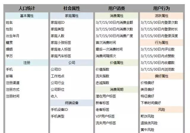 按业务要求,用户画像会划分成多个类别模块,除了常见的人口统计,社会属性外,还有用户消费画像、用户行为画像,用户兴趣画像等。业务不同,用户画像的内容也有所差异,以下分析用户画像的主要内容。