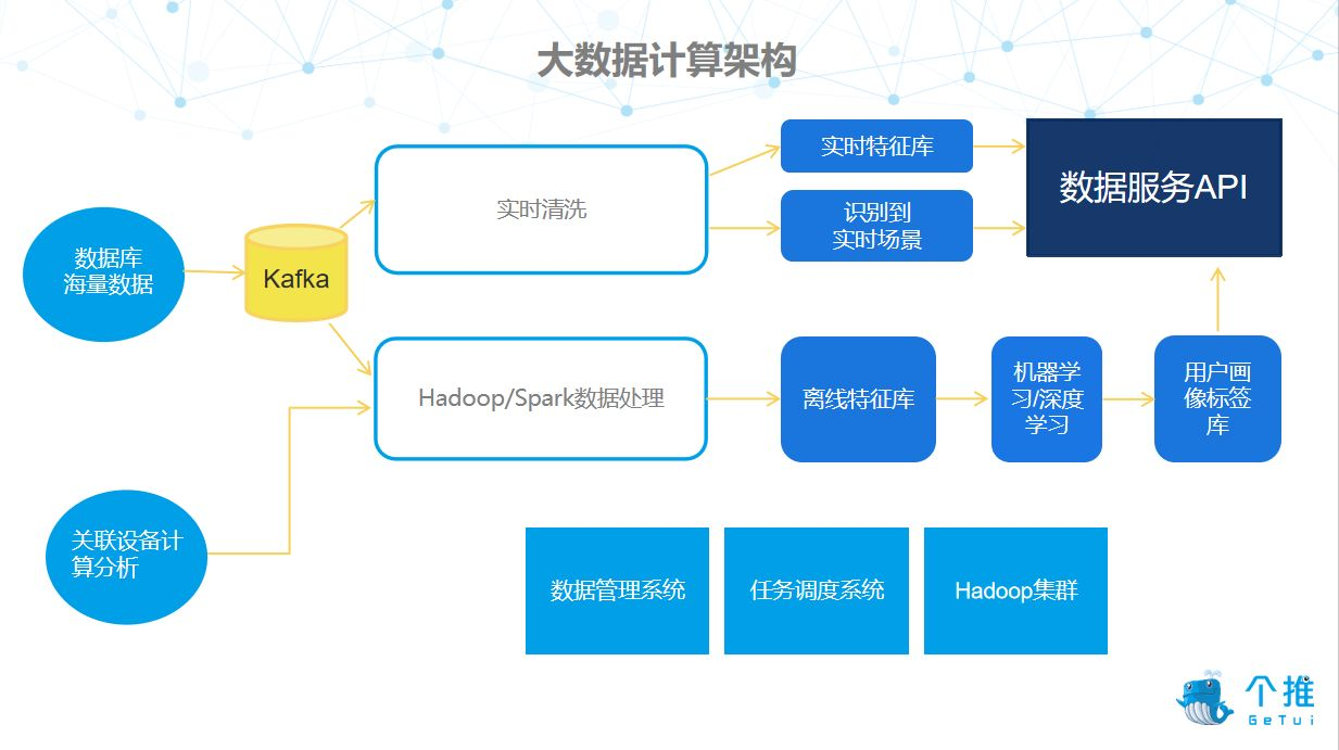 在个推用户画像构建的过程中,机器学习占据了较为重要的位置。机器学习主要应用在海量设备数据采集、数据清洗、数据存储的过程。