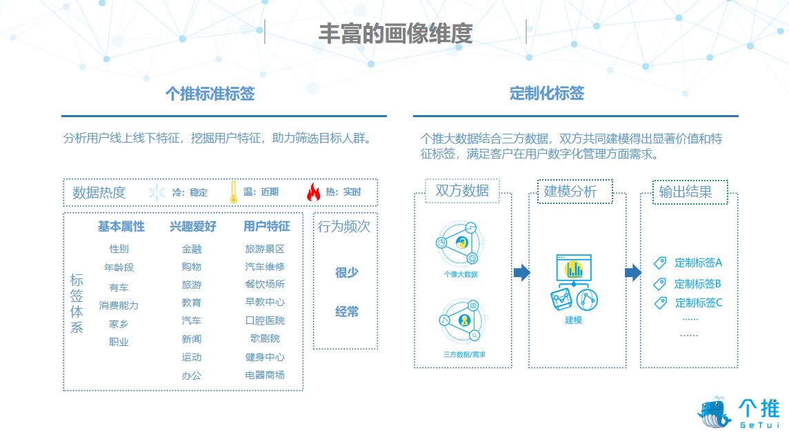 定制化标签是将个推数据与第三方数据结合起来,共同建模得出具有价值的特征标签。总的来说,个推用户画像产品不仅能产出通用的标签维度,也有定制化标签的输出能力。