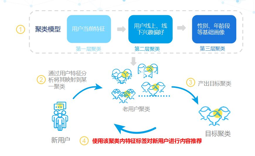 在这里,我们需要解释一下其中所涉及到的相似性建模技术。相似性建模可类比于聚类建模,它是无监督学习中的一种,它指的是寻找数据中的特征,把具有相同特征的数据聚集在一组,赋予这些聚集在一起的数据相同的特征标签,从而给这些具有这些特性的用户推送相同的内容。
