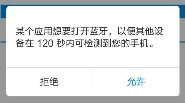 虽然BluetoothAdapter提供了enable方法用于启用蓝牙功能,但是该方法并不允许外部发现本设备,所以等于没用。实际开发中要弹窗提示用户,是否允许其他设备检测到自身,弹窗代码如下所示: