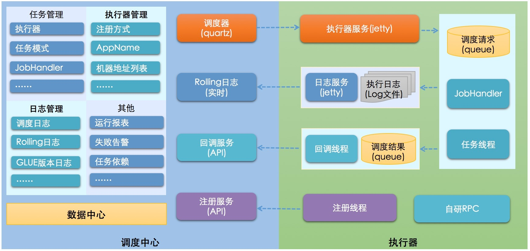 由个人开源的一个轻量级分布式任务调度框架 ,主要分为 调度中心和执行器两部分 , 调度中心在启动初始化的时候,会默认生成执行器的RPC代理对象(http协议调用), 执行器项目启动之后, 调度中心在触发定时器之后通过jobHandle 来调用执行器项目里面的代码,核心功能和elastic-job差不多,同时技术文档比较完善,系统架构图如下: