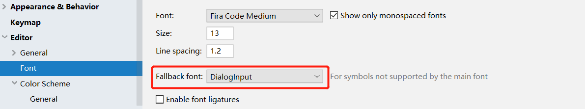 依次点击 File => settings => Editor => Font 中设置 Fallback font 为能显示中文的字体即可