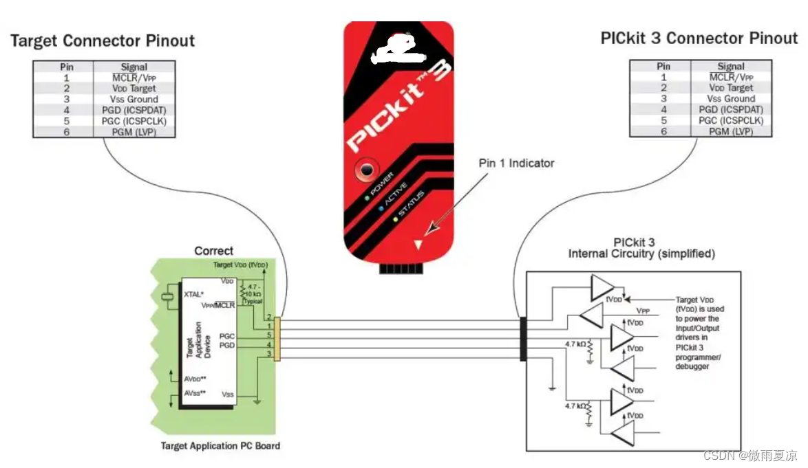 PICkit3为目标器件提供了两种配电方案:内部调试器供电(也就是PICkit3供电)和外部目标电源。在实际使用中,推荐使用外部电源,因为PICkit3提供电源电流限制为30mA,这对于特别是将ic焊在PCB板上再烧录时,提出很大的挑战,所以,如无特殊情况,不建议用内部供电方式。