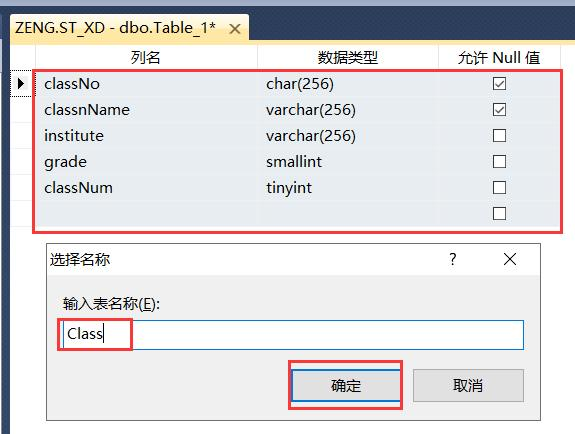 在该数据库中创建数据表,根据关系模式要求填好对应数据,然后用键盘“CTRL+S”跳出输入表名称。这里以我举例的Class表为主,同理其他表操作一样。