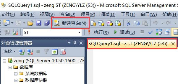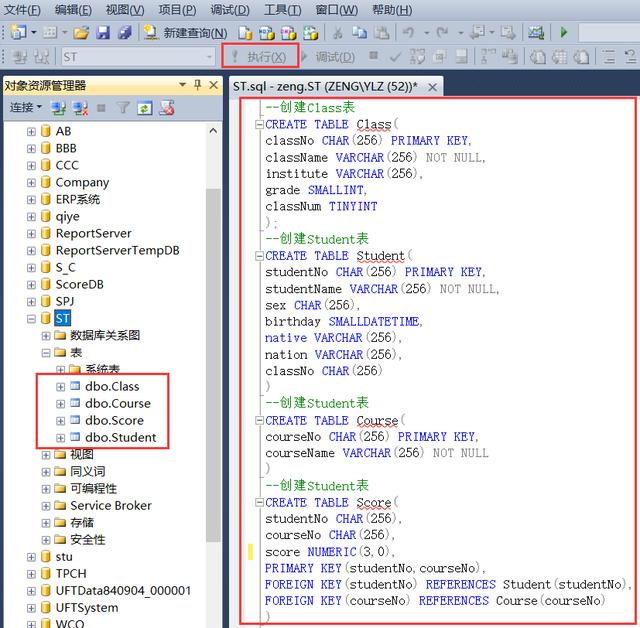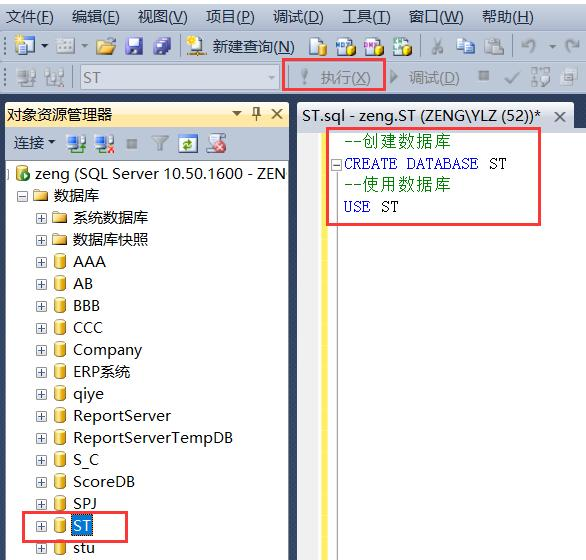 我们编译“创建数据库语法”,然后选取该代码,点击“执行”,然后在数据库处进行“刷新”即可看到创建好的数据库ST。在选取并执行“使用ST数据库”代码,那么,之后在这个页面的代码执行影响的都是ST数据库了。