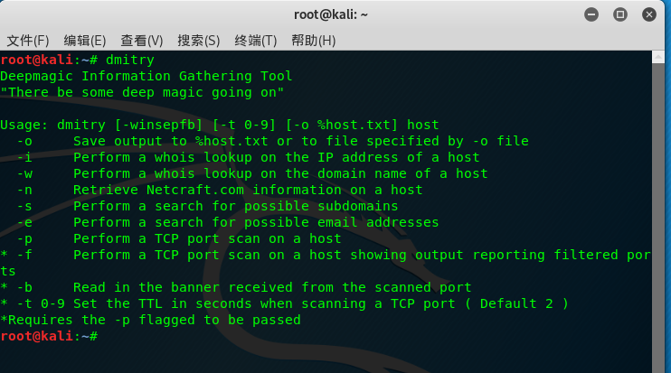 DMitry是黑客渗透流程中进行深度信息收集的利器,它是一个由C语言编写的UNIX/(GNU)Linux命令行工具,无GUI操作界面,需掌握其常用使用参数。