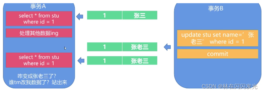 第二次查询得到的name应该还是预期的张三,因为很明确,A并没有对name进行修改,但是在并发环境下,假如两条select语句间有另外一个事务对name执行了update操作并提交了,把张三的名字改为了张老三,A再次执行同样查询导致name由张三变为张老三