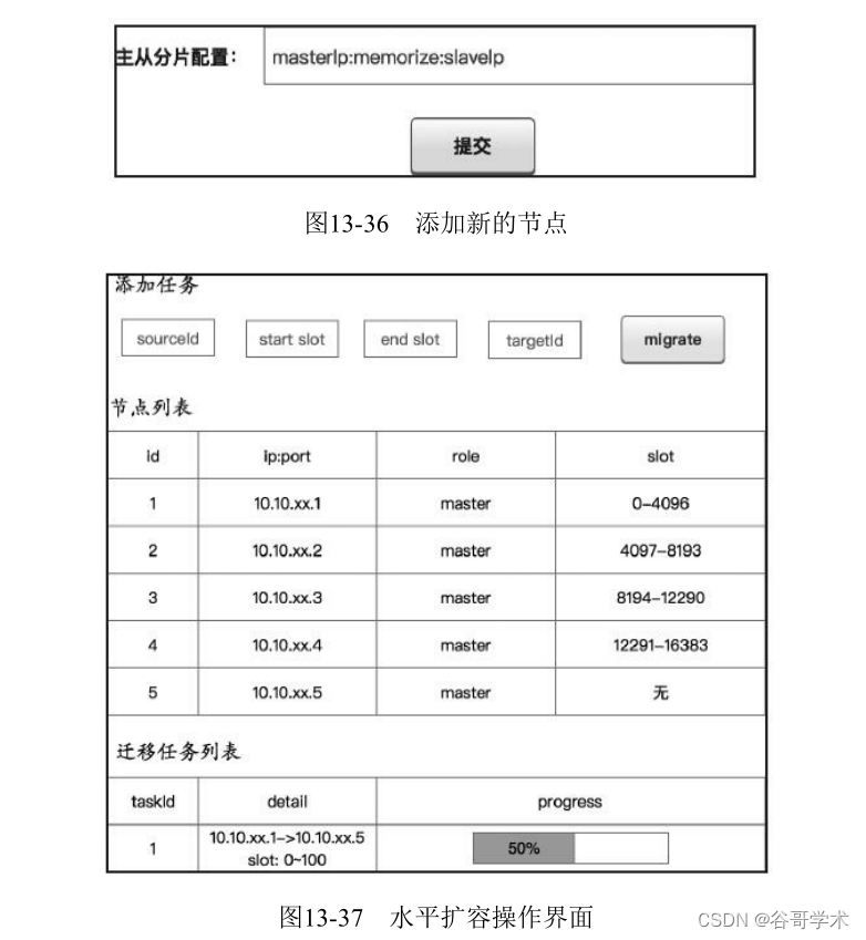 ·水平扩容:添加新的节点,迁移slots等,可以参考10.4节。
