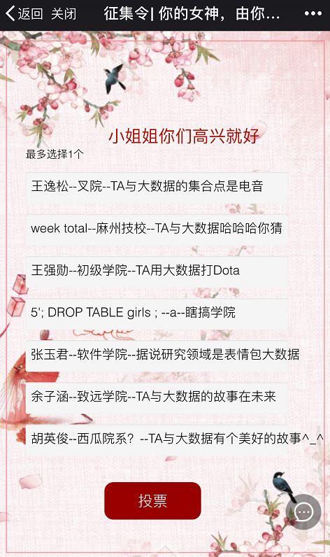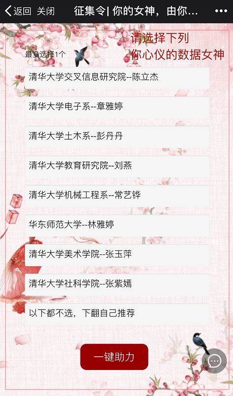在刚刚过去的3月7日女生节,清华学大数据的男生们发起了一个数据女神评选活动,希望在大家的参与下评选出数据女神,送上女生节的礼物。