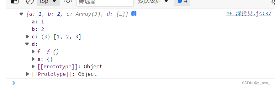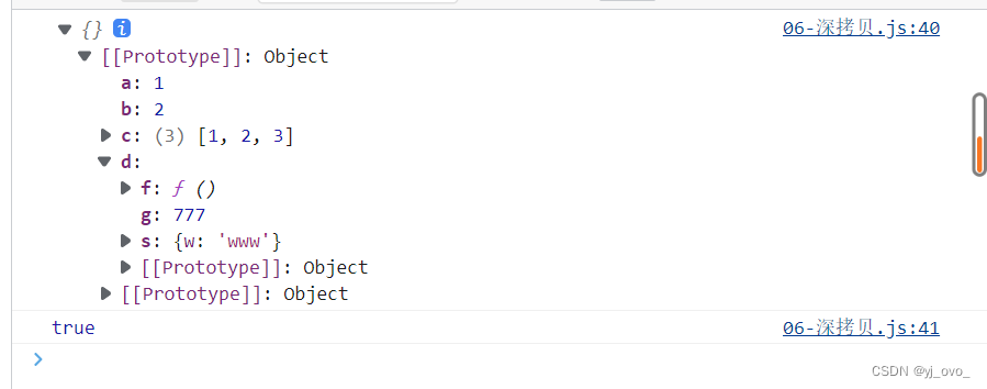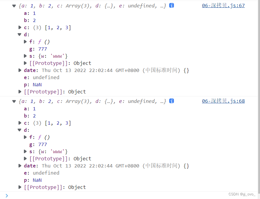 可见,拷贝对象无函数f、无undefined属性e,即该方法无法实现对函数、对undefined值的拷贝 ;