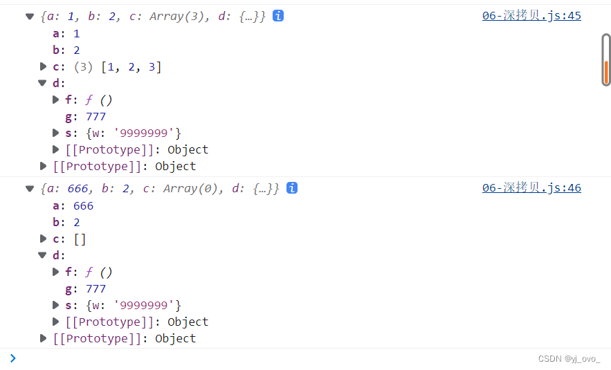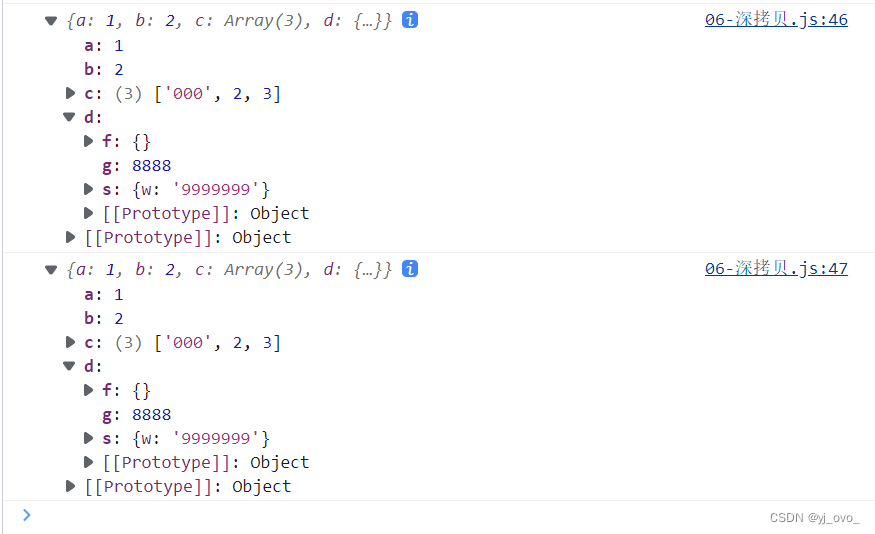 obj1.d.s.w = '9999999' // 对内层引用数据类型进行修改(添加)=>浅拷贝