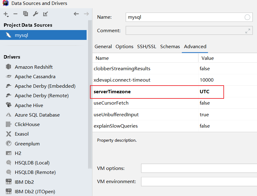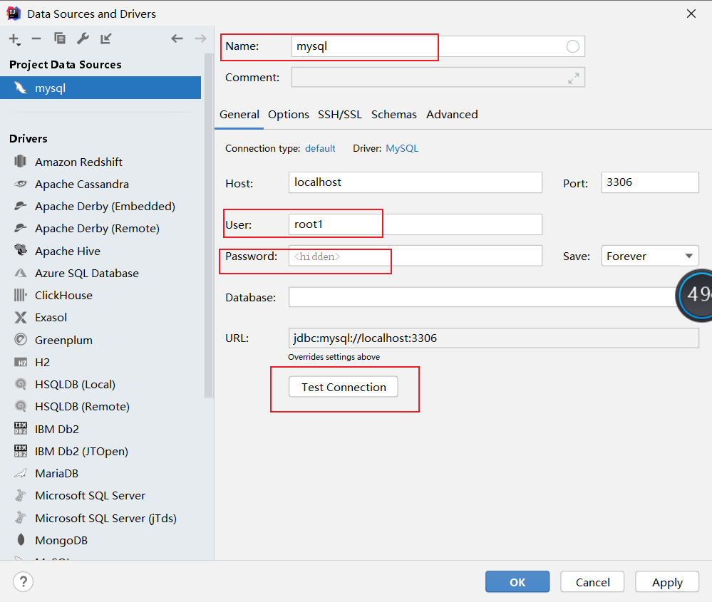 3.自定义一个名字,输入设置的数据库的名字和密码,点apply后,点击advanced找到serverTimezone,在value处填写UTC,应用后点Test connection测试是否能够连接成功