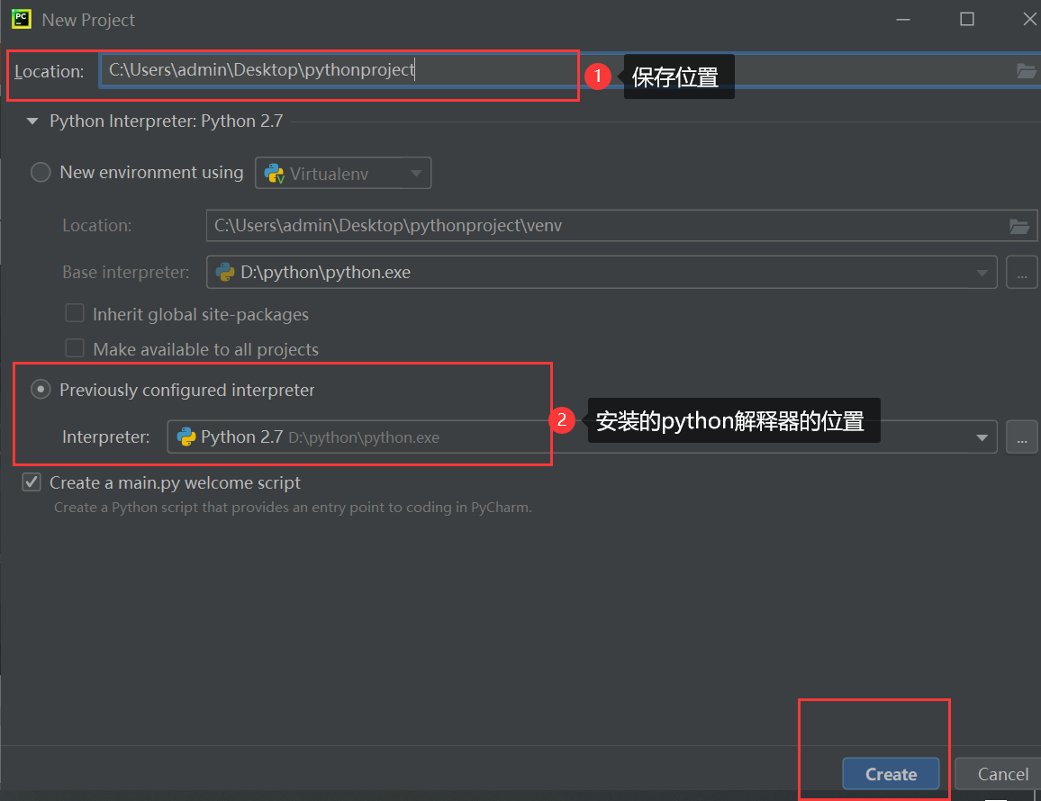 打开pycharm后新建项目,选择项目的路径,选择Python编译器: