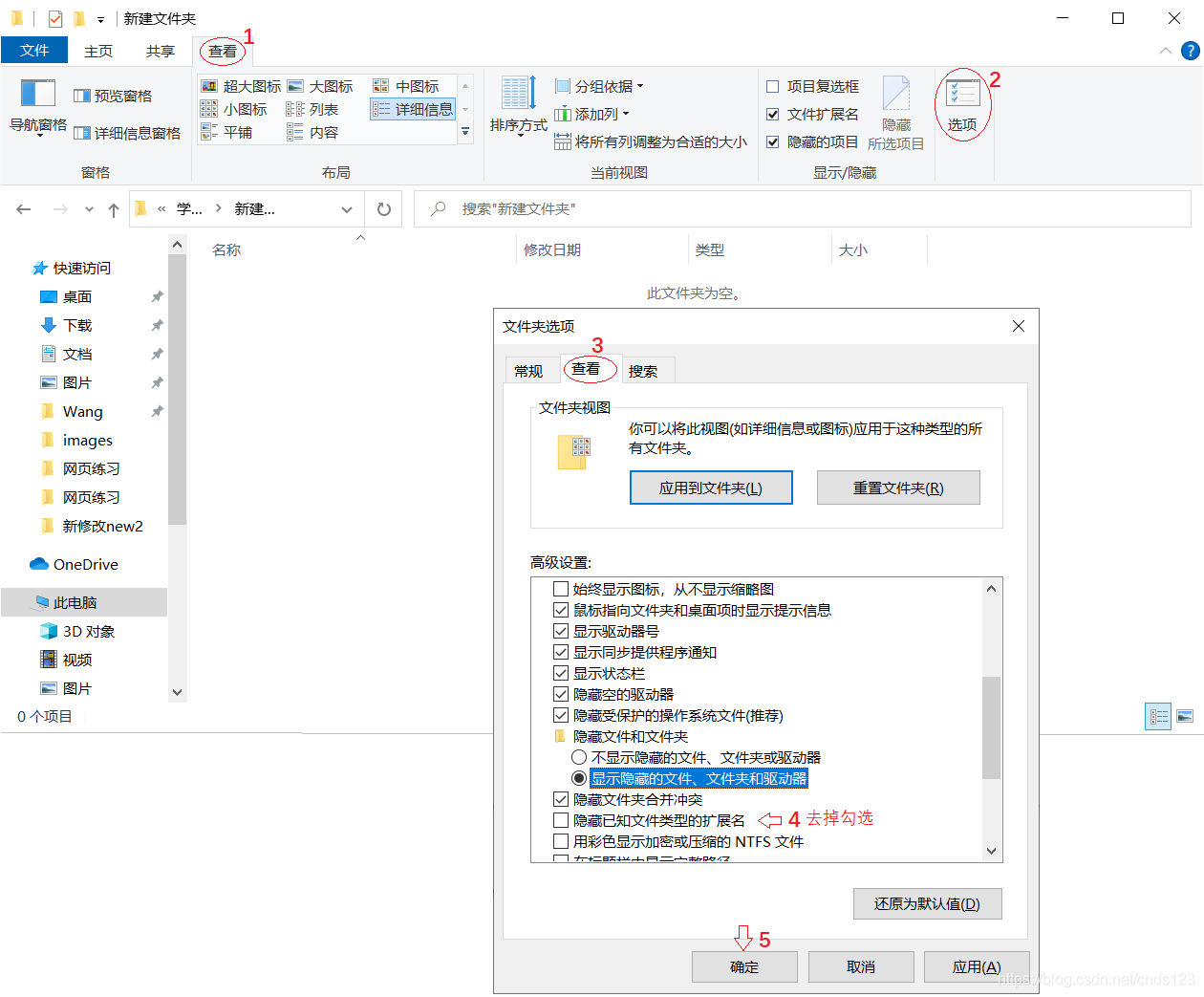 对于Windows10,打开任一个文件夹(也叫目录),单击“查看”选项卡,单击“选项”,,在弹出的对话框中单击“查看”选项卡,找到“隐藏已知文件类型的扩展名”去掉勾选,最后单击“确定”按钮,