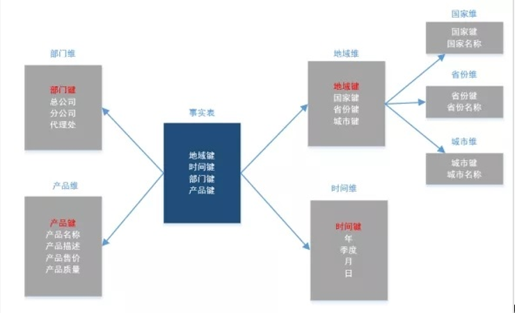 如图,将地域维表又分解为国家,省份,城市等维表。它的优点是 : 通过最大限度地减少数据存储量以及联合较小的维表来改善查询性能。雪花型结构去除了数据冗余。