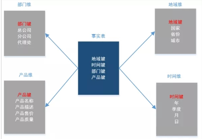 星形模型中有一张事实表,以及零个或多个维度表,事实表与维度表通过主键外键相关联,维度表之间没有关联,当所有维表都直接连接到“事实表”上时,整个图解就像星星一样。