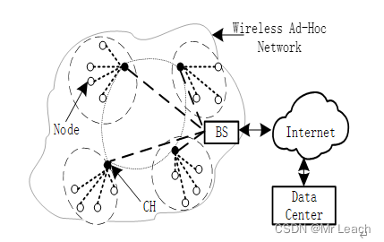 LEACH算法是由MIT的Heinzekman等人提出的第一个WSN分簇路由算法,是具有代表性的分簇、数据融合的成簇路由算法,后来大多数基于分簇的路由算法都是借鉴LEACH分簇的思想发展而来。LEACH的基本思想是:通过等概率周期性的轮换选举出簇头,减少节点与基站(BS)直接通信的个数。提出了以“轮”为整个算法的工作周期,每一轮中都会选举出新的簇头,将整个网络的能量负载平均到每一个节点上,从而达到降低网络通信能耗、延长整个网络生命周期的目的。基于LEACH的无线自组网分簇网络路由协议的网络架构如图所示。
