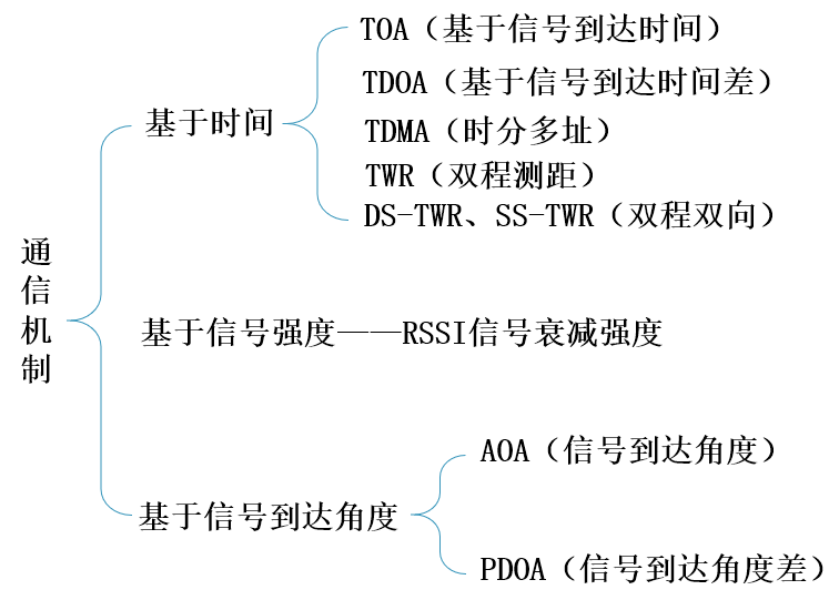 多数论文中将UWB通信机制概述为定位方法、定位方式或定位信息获取方式,总的几种方式可以分为三类:基于时间的获取方式(TOA、TDOA、TDMA、TWR、DS-TWR)、基于信号强度的获取方式(RSSI)、基于信号到达角度的获取方式(AOA、PDOA)。