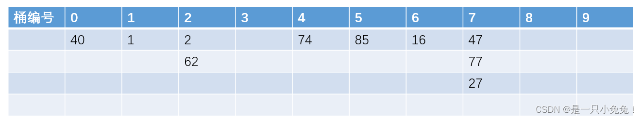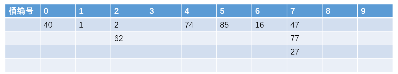 接下来我们先按照桶编号,再按照放入桶中的顺序,一次给数组赋值,从而到如下数组: