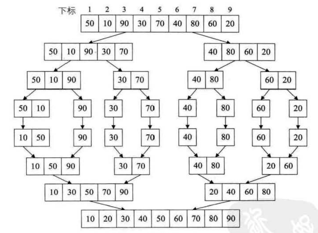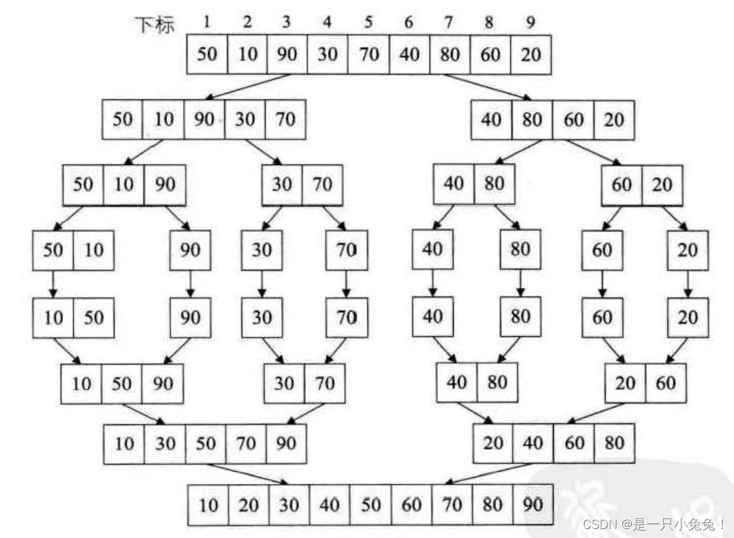 void MergeSort(int* a, int* ans, int start, int end) {//递归int* tempArr = new int[end + 1];if (start == end) {ans[start] = a[end];}else {int mid = (start + end) / 2;MergeSort(a, tempArr, start, mid);MergeSort(a, tempArr, mid + 1, end);Merge(tempArr, ans, start, mid, end);}