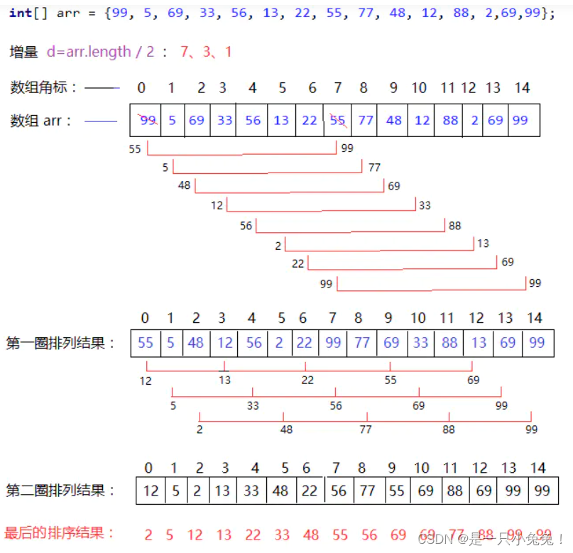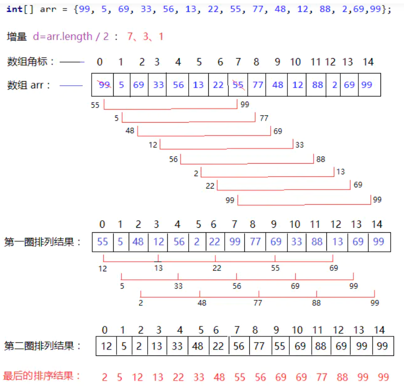 此处引用简书上希尔排序的一个图片,非常清楚的演示了希尔排序思想及其执行过程