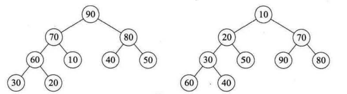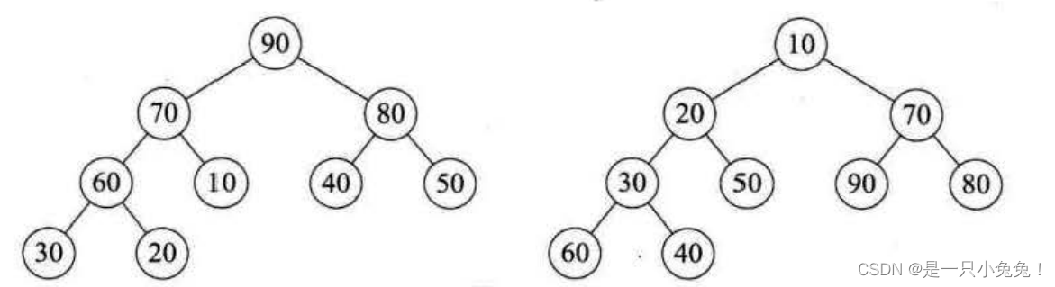 堆是具有下列性质的完全二叉树:每个结点的值都大于或等于其左右孩子结点的值,称为大顶堆 (左图所示) 或者每个结点的值都小于或等于其左右孩子结点的值,称为小顶堆(右图所示)。