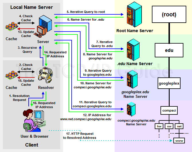 4. 服务器收到查询时,如果要查询的域名由本机负责解析,则返回解析结果给客户机,完成域名解析,此解析具有权威性。如果要查询的域名,不由 Local DNS 服务器解析,但该服务器已缓存了此网址映射关系,则调用这个 IP 地址映射,完成域名解析,此解析不具有权威性。