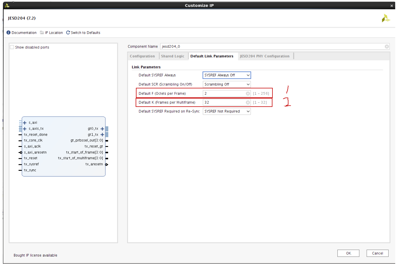 配置jesd204 IP核的工作参数。这里需要注意的是配置的参数和ADC配置模块的参数要相同,比如F,K,N等参数。