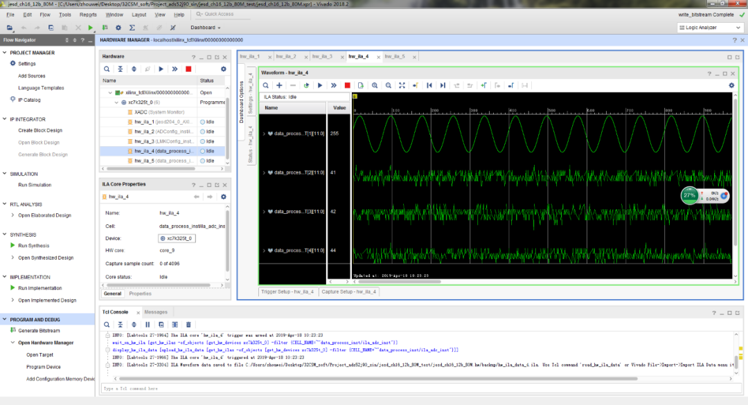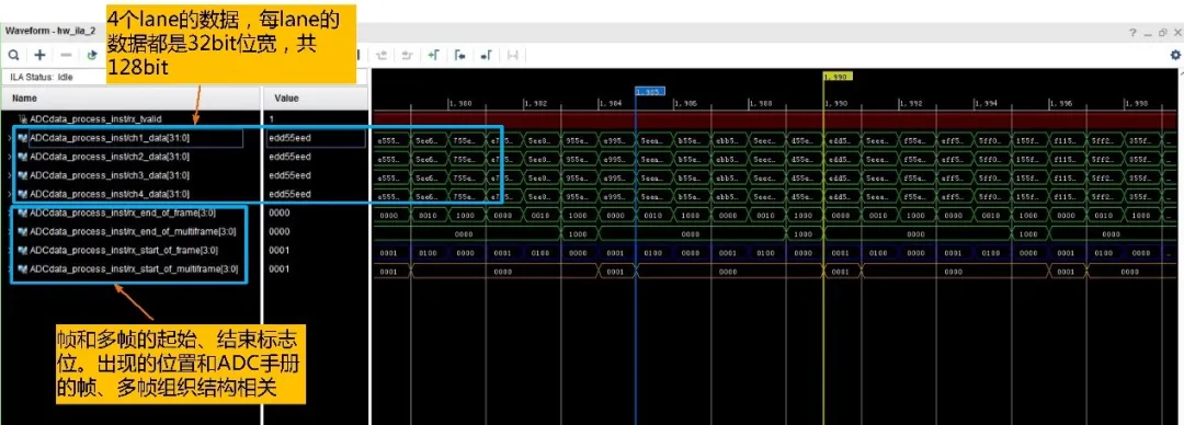 我们通过ILA逻辑分析仪来观察每一路的ADC采样数据,看是否正确。