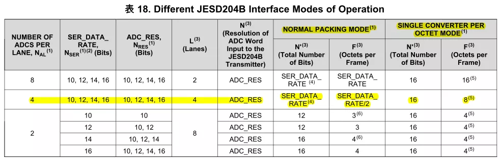 该芯片的采样率、采样精度,采样通道数都有多种模式,用户可选择范围比较大,但必须最终满足每条lane的数据线速率不能高于5Gbps。