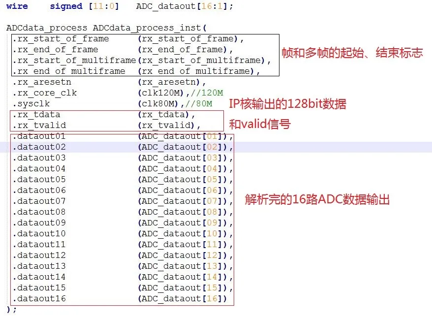 由于IP核输出的数据是128bit位宽,在120MHz的时钟域下工作。而ADC采样时钟是80MHz,所以ADC数据解析模块的功能就是将总共4 lane的这些数据分离,变成16个ADC的12bit精度的连续采样数据。每款ADC芯片的数据组织结构(其实就是JESD204B的传输层数据结构)不一样,所以该模块不具有普适性,只针对本篇的需求~